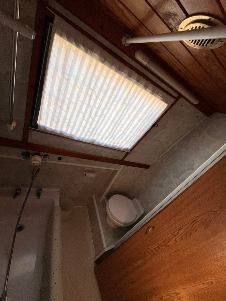 The plan is to completely overhaul the bathroom (it’s hideous!) I am considering installing a walk-in shower, removing the pump-out toilet and its tank (which runs under the bed in the 2nd bedroom), and replacing it with a small sink. I’d also love to take out the cupboard and create space for a small washing machine. That’s the plan, anyway!